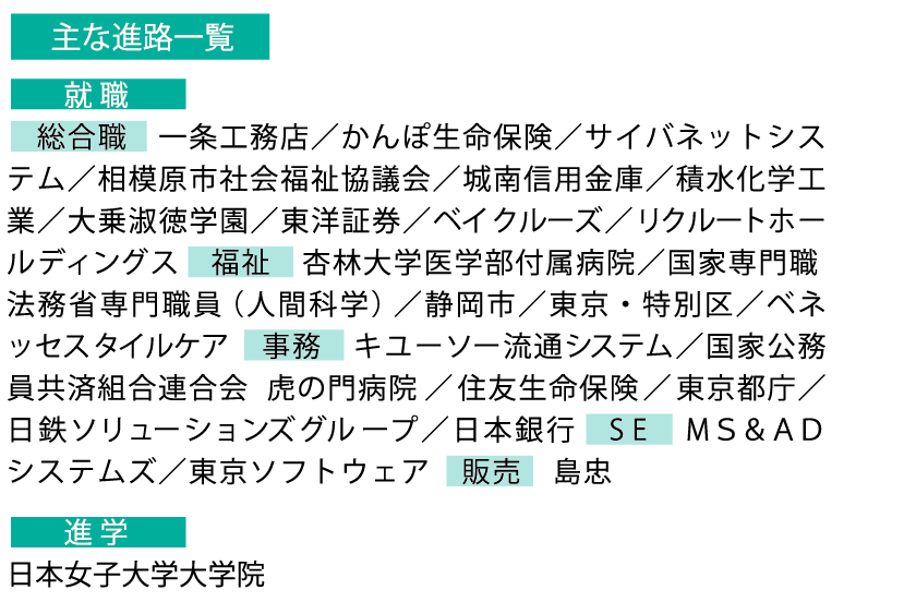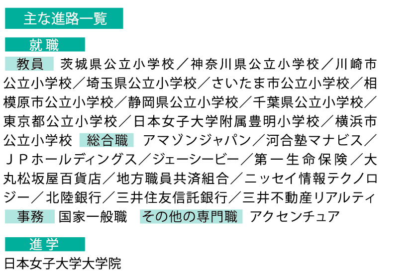 本学人間社会学部は「人間社会学部」という名前を最初に掲げたパイオニアです。人文科学だけでなく、社会科学だけでもない、まさに「人間と社会」を総合的に学ぶ新しい試みがこの地から始まったのです。五つの学科(現代社会、社会福祉、教育、心理、文化)は、それぞれの分野で「人間と社会」を深く理解する「豊かな知」、それを応用して「社会的に実践する技」を学ぶさまざまな授業や少人数制の演習、実習科目を提供しています。目標は、豊かな人間性と女性の生涯の基礎となる知や実践力の獲得です。人間と社会を総合的に学び、ヒューマンサービスを中心に拡大する職業分野を視野に入れ、社会に貢献できるキャリア育成をめざします。なごやかでのびのびとした学習環境が、あなたの成長を約束します。