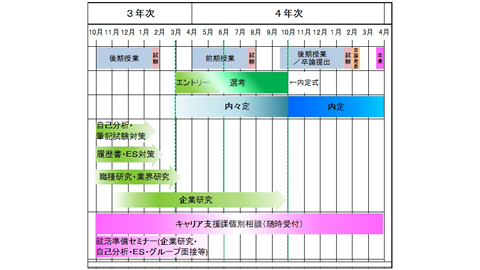 2024年3月卒業予定の就職活動スケジュールは引き続き前年どおりとなりました。しかし、企業の採用動向は更に早まるとともに、短期インターンシップについても増加傾向にあります。内定を得るまでには、セミナー、説明会をはじめとする催しへの参加、エントリーシートや自己PR書、履歴書などの作成と提出、Webテストや筆記試験の受検のほかグループディスカッションやグループワーク、集団面接、個人面接など様々な関門をくぐり抜けなければなりません。