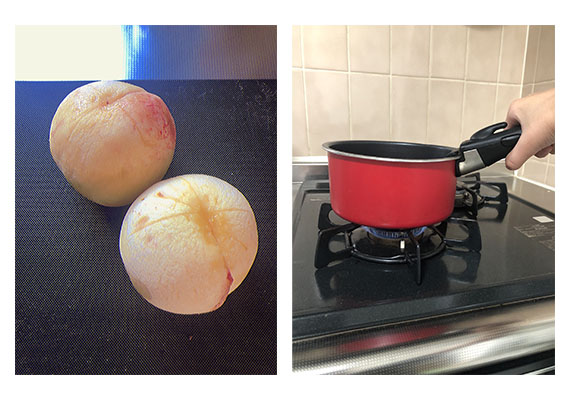 7月某日、私は今、キッチンで桃を煮詰めています。というのも、先日実家から、たくさんの桃が届いたからです。甘い香りが部屋中に広がっています。