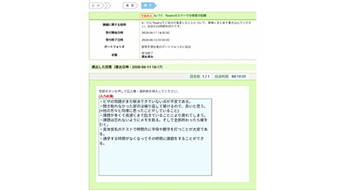 そして、ふと「このように大変なのは私だけなのか」と思ったら、何となく寂しくなりますよね。ちょうどその頃、「教養特別講義」という科目でTeamsセミナーがありました。セミナーではオンライン授業を受講した感想、課題や問題点、工夫している点などをクラスメートと話し合いました。この話し合いを通して、私だけではなくみんな大変なことがあって不安なときもあったことに気づき、共感しながら話を聞くことで、安心感が生まれました。