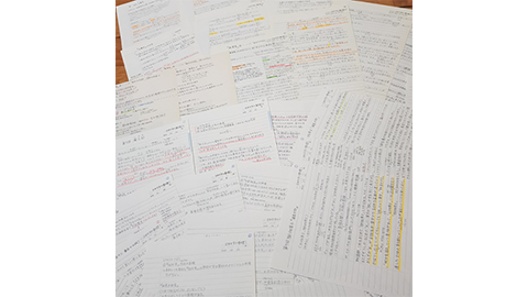 工夫の1つとして、先生の話したことを書きとることがあります。私が最も難しいと感じた授業、「日本文学の基礎Ⅰ」はオンデマンド授業で、録音された先生の音声を聞く形でした。しかし、聞くだけでは講義の内容が理解できなかったため、先生が話したことを聞いて書きとりをしたわけです。私はこの講義がオンライン授業で本当に良かったと思いました。対面授業だったら、先程先生が何を言ったのか聞き直すこともできず、とても苦労しただろうと思われます。