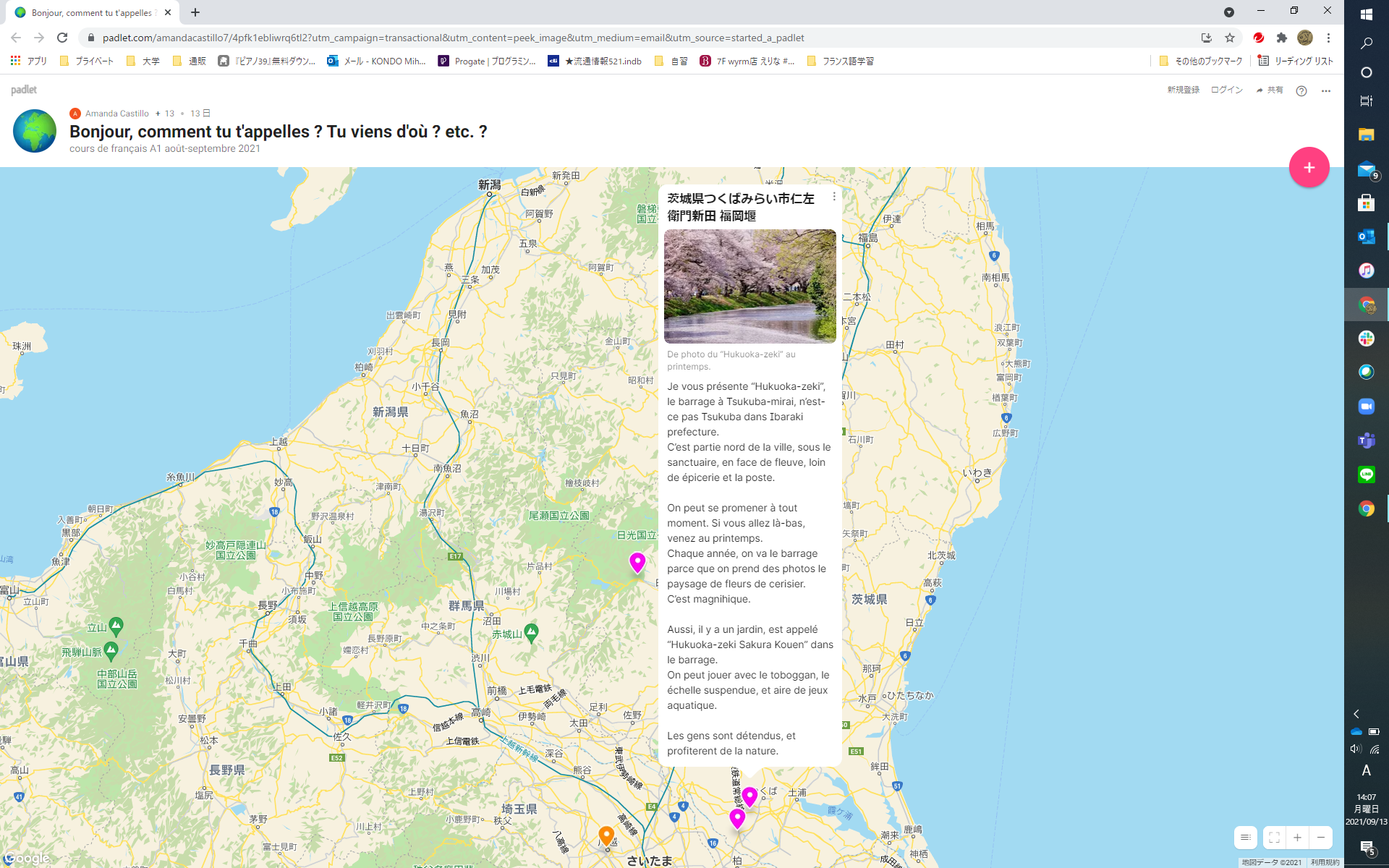 Je vais maintenant vous parler de ce que j’ai fait pendant cette formation. Les cours sont relayés par une école de langue en France, et les manuels utilisés en classe sont des sites web et des documents préparés à l’avance par l’enseignant. En allumant la caméra et le microphone de mon ordinateur, j’ai pu suivre ces cours en ligne comme si j’y étais. Grâce à ces cours, j’ai pu non seulement me présenter et présenter ma ville, mais aussi utiliser des expressions de la vie quotidienne.