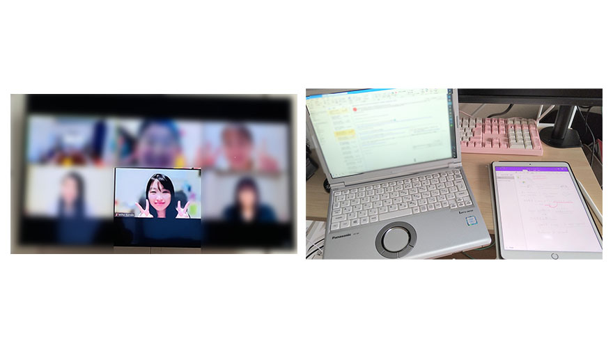次に実際のオンライン語学研修でどのようなことをしたかをお話します。語学研修では海外の語学学校と中継し、授業を行います。先生が事前に送付した資料やインターネットのサイトが授業の教材として使われました。授業中はカメラとマイクをONにしているため、実際にその場にいるような感覚で授業を受けることができました。授業を通じて、フランス語で自己紹介をし、好きな街の紹介をするだけでなく、道案内など日常で使う表現の活用ができるようになりました。
