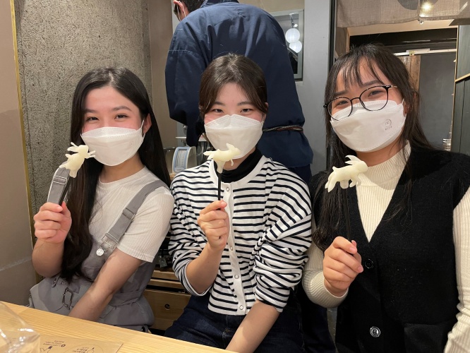 こんにちは。私は文化学科1年生です。今回は、私が行っている留学生チューターについてお話します。留学生チューターは、日本女子大学に勉強しに来る留学生の、勉強や、日本で暮らすための手続きなどを手伝います。その他にも芸術鑑賞に行ったり、一緒に遊びに行ったりと、留学生との楽しい時間を過ごすことが出来ます。私は今年、ベトナムからの留学生のサポートをしています。毎回会うたびに、ベトナム語を教えてくれたり、ベトナムと日本の違いを教えてくれます。一緒に浅草観光をした際には、飴細工体験をしました。うさぎを作る予定が、みんな慣れておらず、謎の生物になってしまい大爆笑をしました。また、上野観光をした際には、お好み焼きを食べに行きました。留学生たちもお好み焼き作りを体験しましたが、みんな上手に作ることが出来ていました。