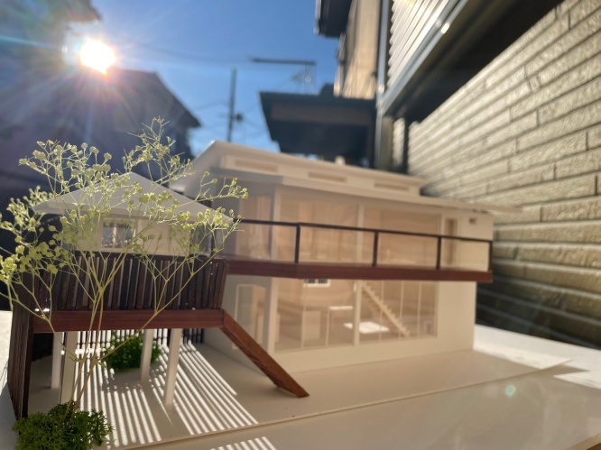 大学1年生の授業の最終課題では自分で住宅を設計しました。私は開放的な空間と閉鎖的な空間を合わせもった住宅を考えました。別荘のような小さい別棟を設けたのが特徴です。初めての自主設計でしたが、とても満足のいく作品を作ることができました。私がこの住宅模型を作成する上で最も時間をかけた部分は木の格子です。ペンでダークブラウンに色付けし、格子が等間隔になるように工夫しました。