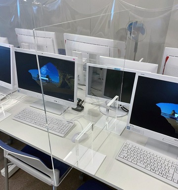 同時に授業中にPCトラブルが発生した際、スタッフはメディアセンター事務室から教室に行かなくても遠隔サポートできるシステムを導入しています。また、学生がキャンパス内から遠隔授業を受講できるようにWi-Fi、電源設備環境の整った専用の教室を用意し、スムーズに授業を受けられるような体制をとっています。さらに昨年度より学生がコンピュータ演習室のPCを自宅からも利用できるようにリモート接続サービスを実施しており、2021年度に新設された百二十年館の全教室、全学生滞在スペースでWi-Fiが利用できる自習環境を整えています。