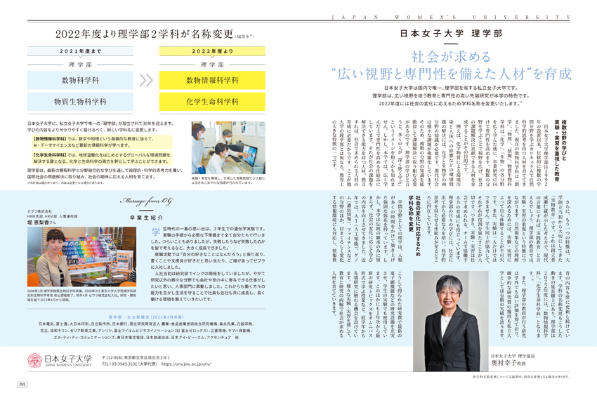 日経HR「日経キャリアマガジン 価値ある大学2022年版」(2021年6月2日発行)に、「日本女子大学 理学部 社会が求める“広い視野と専門性を備えた人材”を育成」が掲載されました。