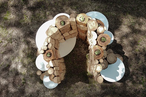しかし、虫や小動物や鳥はシェアするベンチとはどんなものか、創造がつきませんでした。それは、既存のベンチの形に捕らわれたいたからでした。森には、いろいろな動物が共生しています。それは、彼らは、地面からの高さによって、住み分けているのだということに気が付きました。そこで、倒木を色々なサイズに切って、低いものから、高いものまで、リング状に並べることにしました。そしてところどころに、人間のためにスチールの丸い板を挟みこみました。人間も森の動物の仲間に加えることにしました。