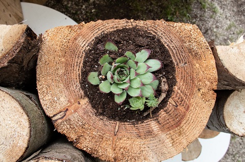 また、作品タイトルにある「Tobusa」とは木こりが切った切り株の上に、切った木の枝を供えて、山の神に森の再生を祈った鳥総(とぶさ)という日本の伝統的な儀礼からきています。何か所かの切り株の上に植物が植えられているのは、そのためです。
