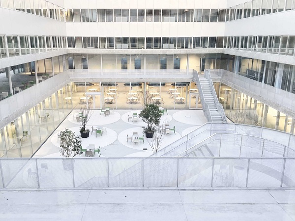 ガラス張りの校舎に囲まれた吹き抜けの中庭は、ランチに、おしゃべりに、勉強に、そして、ちょっとした気分転換にも利用できます。使い方は自由です。