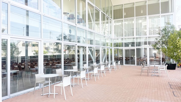 また、入り口付近には大きなホワイトボードが設置されていて、学内で行われる講座のお知らせやお弁当の販売についてなど、様々な情報を掲示できるようになっています。1階から外のテラス席にも出られるので、晴れた日には学生たちが思い思いに時間を過ごしています。
