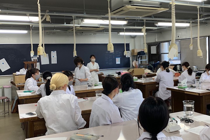 理系分野の一例として、「衣材料学実験」では、実験を通じて繊維の特徴を学びます。白衣を着て、顕微鏡や薬品を使用して、繊維の観察を行い、他の授業でも応用できる繊維の基礎知識を身に着けます。