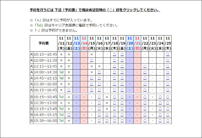 今回、開発したシステムでは、学生がインターネット上で各相談員の予約状況を確認し、空いている時間帯を選んで直接申込をすることができます。