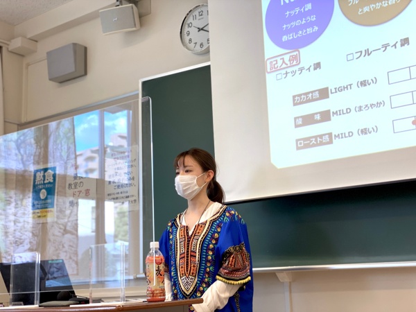 小峰さんからは、カカオ農家に対する生活向上のための支援や生産に関する指導など、健全な労働環境を提供し、サステナブルな原料調達を行う明治の活動「メイジ・カカオ・サポート」が紹介され、学生は、食べ物そのものだけでなく、食べ物の背景についても学びました。