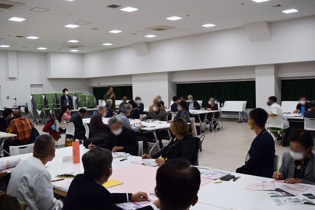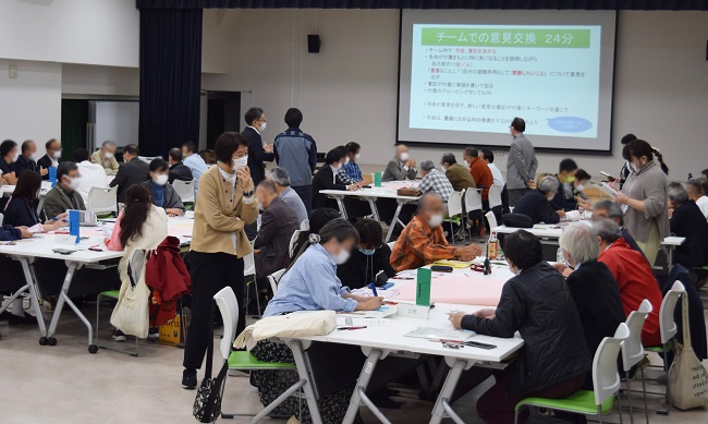 文京区と連携して実施しているため、文京区の各避難所の運営リーダー、町会から推薦されて防災士資格を取得した方々、町会役員、区議会議員などから約50名もの参加者があり、広い会場ではいくつかのテーブルに分かれて活発に議論が行われました。ワークショップ型の勉強のため、町の中で活躍する多世代の人々が熱心に避難所のこれからについて意見を述べていくのが特徴で、その意見はその場でシェアされていきます。