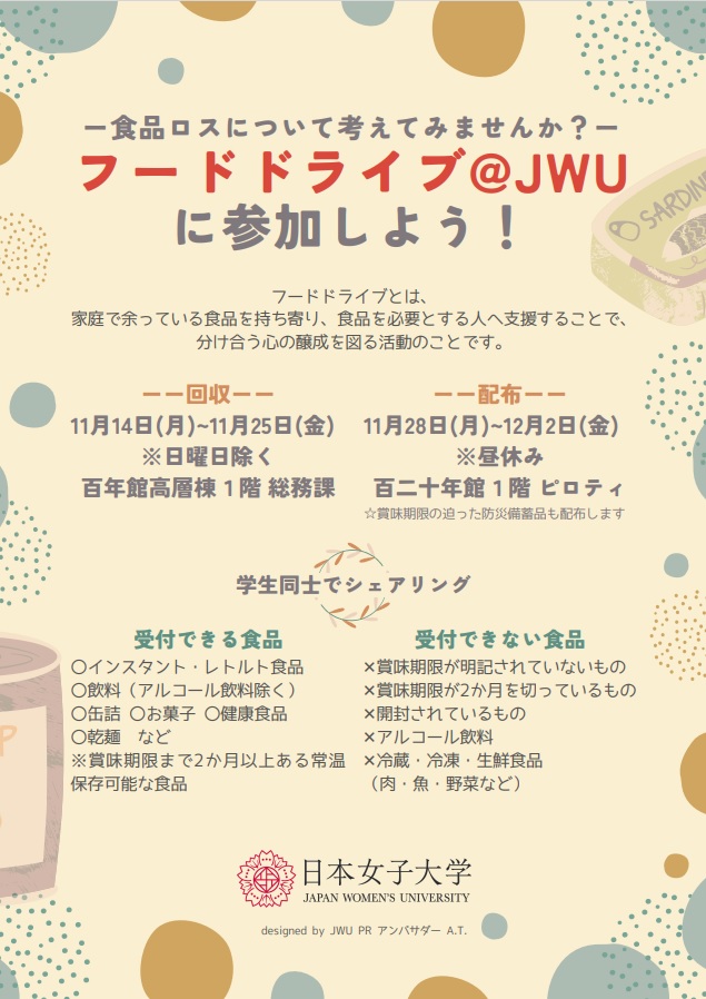 日本女子大学では、11月14日(月)より「フードドライブ@JWU」を実施しており、私たちJWU PR アンバサダーもこの活動に協力しています。