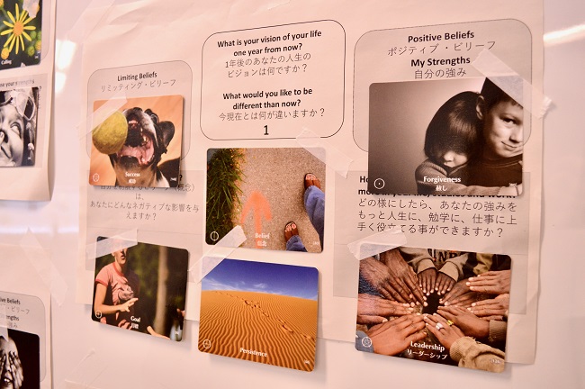 第2回の講座で、受講生はビジョン・ボードを作成しました。「1年後になりたい自分」を設定し、それに対して「Limiting Beliefs(リミッティング・ビリーフ=自分自身を制限している思い込み)」と、そこから受ける影響について考えました。一方で、「Positive Beliefs(ポジティブ・ビリーフ=肯定的な信念)/My Strengths(私の強み)」を見つけ、どのようにしたら強みを社会(仕事・勉学など)に役立てることができるかについても考えました。絵柄のカードから感情に合うものを見つけて貼り、英語で表現する手がかりとしました。講座の後、自身の身近な家族などに「私の強みは何か」と聞いた受講生もおり、自身の思い込みや強みに気づくきっかけとなりました。そして、この自身の強みを「パーソナル・ブランド」(私らしさ)として、プレゼンテーションの根底に据えていきます。