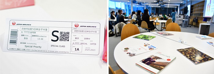 講師を務めていただいたのは、日本航空株式会社(以下、JAL) 産学連携部 人財開発グループの坂口花実(さかぐちはなみ)さんと田中優子(たなかゆうこ)さん。客室乗務員としても業務をされているお二人による、会場を機内に見立てた素敵な演出とともに、イベントは進んでいきます。