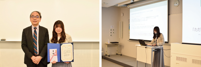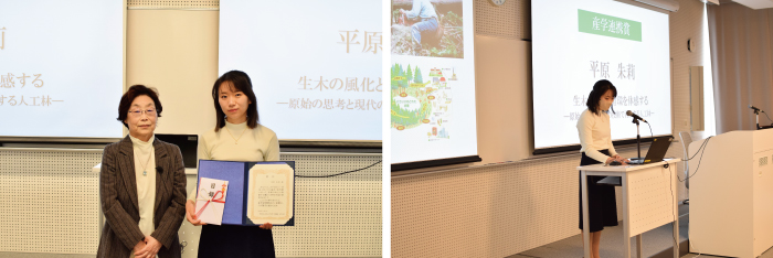 最優秀賞、産学連携賞、社会連携賞、優秀賞、特別賞、奨励賞の受賞者を表彰し、最優秀賞、産学連携賞、社会連携賞の受賞者は各自の論文・制作を発表しました。それら受賞論文・制作に対し、日本総合住生活株式会社(JS) 石渡 廣一顧問、今市涼子理事長ならびに篠原聡子学長よりコメントをいただきました。