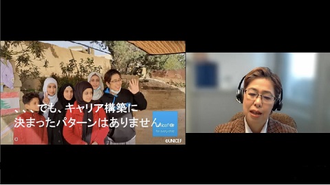2023年3月8日(水)、「国際的な機関で働くOGに聞く」の第3弾として、国際女性デー記念講演がオンライン開催されました。今回は、日本女子大学附属高等学校、日本女子大学家政学部住居学科の卒業生で、現在はユニセフ(UNICEF:国連児童基金)ジュネーブ民間支援企画調整局副局長として活躍されている杢尾雪絵(もくお ゆきえ)さんに、スイスよりご講演いただきました。この講演は、キャリア支援課と国際交流課が共催し、本学在学生、教職員、本学進学予定者も含めて57名が参加しました。