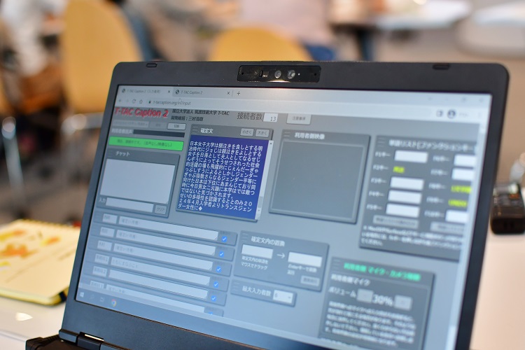 本学のノートテイクでは、筑波技術大学が開発した「T-TAC Caption2」という遠隔情報保障システムを活用しています。このシステムは、インターネットに接続したパソコン以外に特別な機器が不要で、複数人での連係入力も可能である点が特徴です。