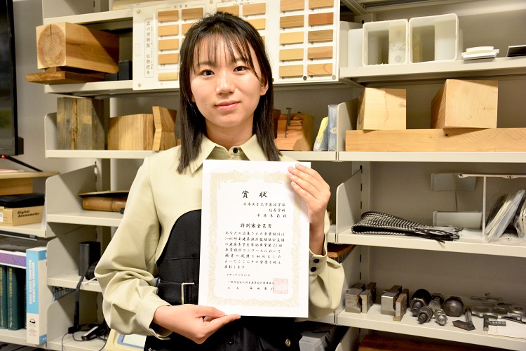 住居学科の学部生だった2022年度に、(一社)埼玉建築設計監理協会主催の建築系学生奨励事業「第23回卒業設計コンクール」にて、「生木の風化と循環を体感する–原始の思考と現代の技術で再生する人工林」という作品で特別審査員賞を受賞された、家政学研究科住居学専攻修士1年平原朱莉さんにお話をうかがいました。