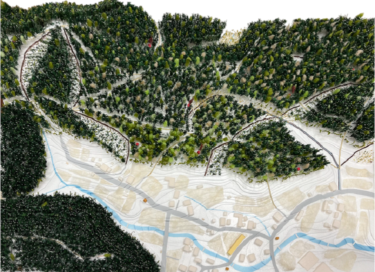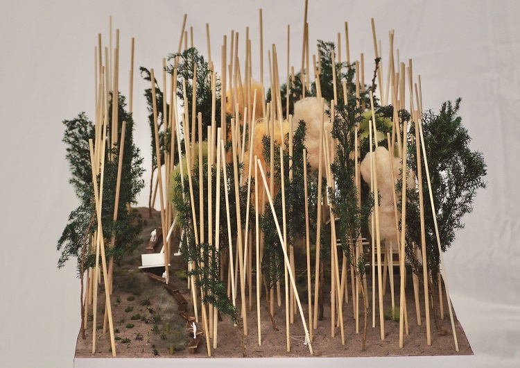 そこで今は入って行こうとも思わない人工林を開くために、人工林に切り株を用いて道を作り、人が木に触れられるような場所に変えていけないかという提案をしました。林に入った人が人工林への意識を変えるきっかけとなる空間である、小さな小屋も設計しています。また、スギの木を伐採した後は、樹種をコントロールしながら、生物多様性に良い針葉樹と広葉樹の混合林にしていくことも考えました。