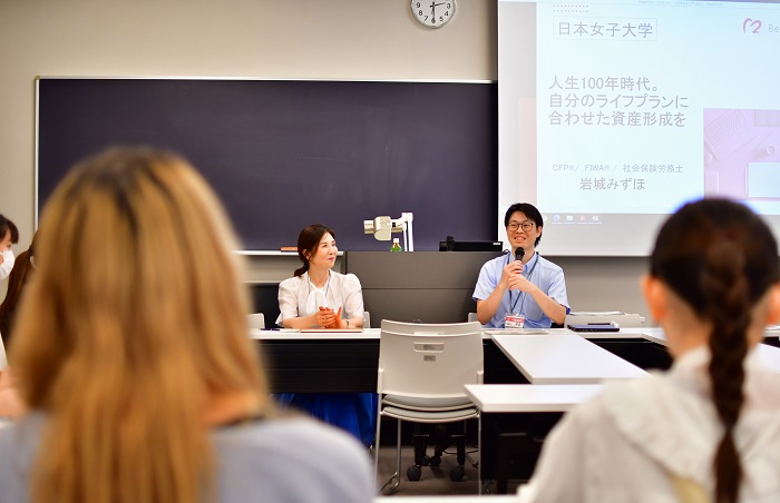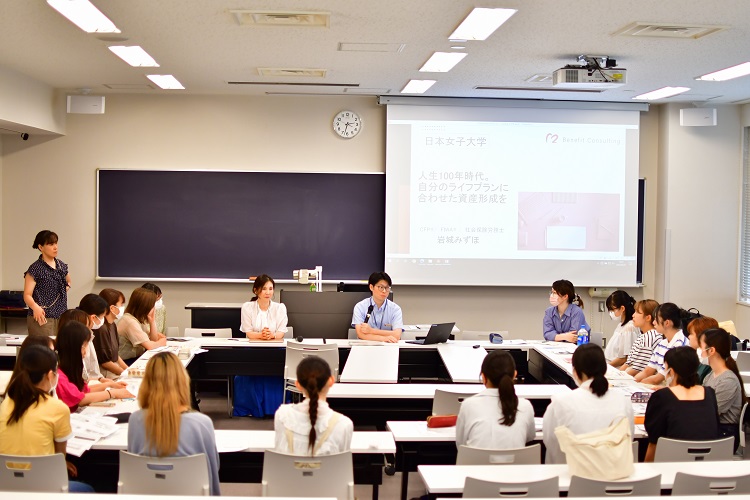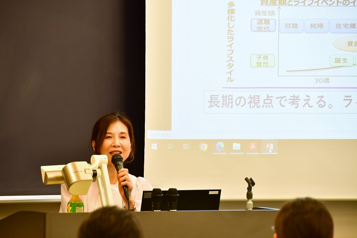 岩城さんには「人生100年時代。自分のライフプランに合わせた資産形成を」と題し、平均寿命が男性よりも長い女性がライフ・キャリア・マネープランをどのように考えれば良いかや、資産形成のポイントなどをお話いただきました。学生たちは岩城さんの話に耳を傾け、手元の資料にその内容を熱心に書きとめていました。