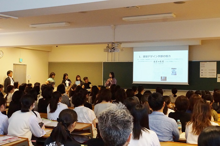 また、「学生目線で見る建築デザイン学部の魅力」と題した学生企画では、来場された方にとって先輩にあたる5名の在学生(学部4年生:4名、修士1年生:1名)が登壇。建築デザイン学部の授業や研究内容について、また学生生活における不安や楽しみなど、自分たちの経験から建築デザイン学部で学ぶことの魅力を紹介しました。