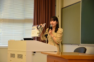 桑島さんからバトンを引き継いだのは同じく数物情報科学科の物理コースから数理・物性構造科学専攻に進学された正露瑞季さん。株式会社日立製作所から東日本旅客鉄道株式会社に出向中とのことですが、学生時代を振り返ると、データ分析や論文作成、学会での発表など、1つ1つの経験が現在の業務上でも役立っていると話します。「先生と学生との距離がすごく近く、なんでも相談に乗ってくれました。私を育ててくれた大学です」と学生時代を振り返っていました。