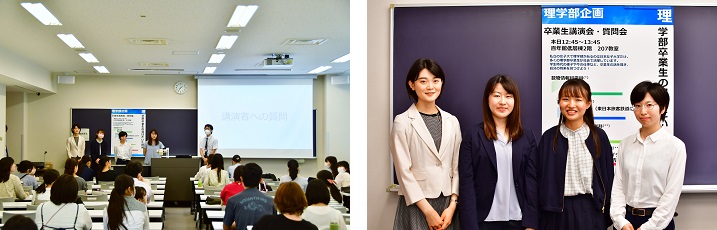 理学部では「理学部卒業生の羽ばたいた世界」と題して講演会が行われ、各学科2名ずつ計4名の卒業生が講演を行いました。