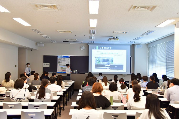続いて化学生命科学科からは、染谷玲菜さんと福島早貴さんが登壇しました。森永乳業株式会社で充填機のオペレーション業務に携わっている染谷さんは「大学でのさまざまな実験を通して培った、問題が発生した際にどの過程に問題があったのかを考察する能力が、今の業務でも生かされています」と話されていました。学科の特徴である化学と生物を横断的に学ぶことが、社会に出てから強みになっているそうです。