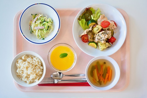 食物学科管理栄養士専攻の3年次には、「給食経営管理実習」という必修の実習授業があります。この実習では学生が班ごとに献立を考え、調理工程を検討し、実際に調理して本学関係者に提供します。今年度は6月7日(水)~30日(金)までの毎週水曜日と金曜日に、A・Bクラス合わせて計8回の食事提供をしました。全ての献立は、多くの医学団体のコンソーシアムが認証している健康増進を目的とした450~650 kcal未満の「スマートミール(ちゃんと)」の基準に従って作成されています。