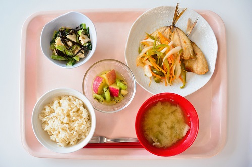 胚芽米、ごぼうと豚肉の味噌汁、鯵の南蛮漬け、蓮根と小松菜のわさびマヨ和え、りんごとキウイのはちみつレモン