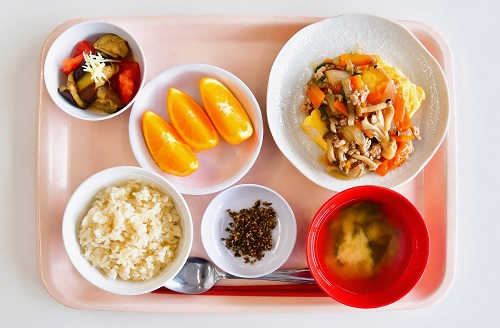 胚芽米・かつおふりかけ、切り干し大根と小松菜の味噌汁、ふわふわあんかけたまご、生姜香る夏野菜の和風マリネ、オレンジ