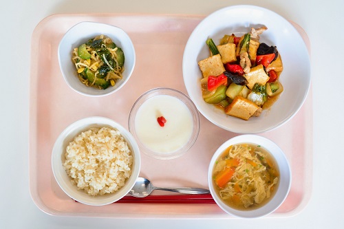胚芽米、にんじんと卵のスープ、厚揚げのピリ辛炒め、きゅうりともやしの さっぱり和え、生姜杏仁豆腐