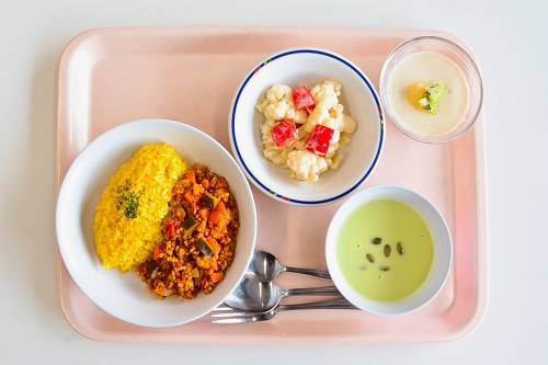 ターメリックライス、枝豆の豆乳スープ、大豆ミートのドライカレー、カリフラワーとパプリカのマヨ和え、ココナッツプリン