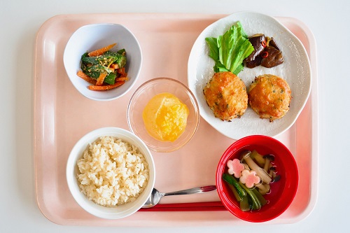 胚芽米、小松菜としめじのすまし汁、味噌つくね南蛮茄子添え、オクラと人参の胡麻和え、桃のシャーベット