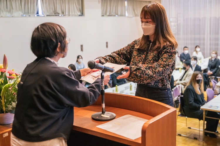7月23日(土)、百二十年館のJWUラーニング・コモンズかえでにて、「2021年度帰国留学学生報告会/ 2022年度協定・認定大学留学学生奨学金授与式」が行われました。