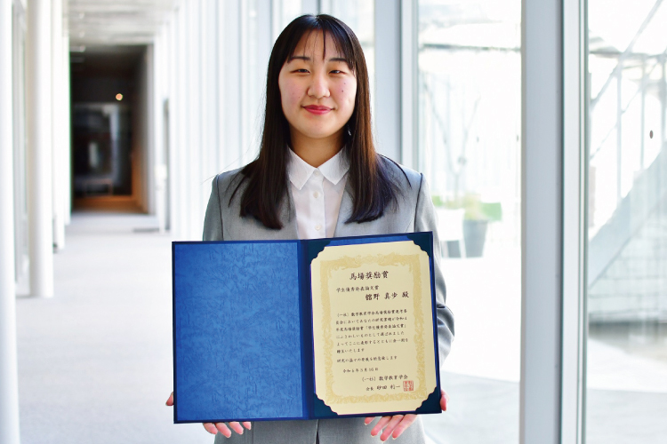 2023年3月に本学を卒業され、教育者の道に進まれた理学部数物情報科学科の舘野真歩(たての まほ)さんは、2023年度の数学教育学会春季年会にて、「数学の有用性を伝えるための教材開発 数学が広げる…