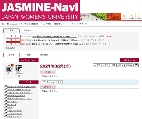 JASMINE-Navi(ジャスミン-ナビ)は、履修登録・時間割照会・成績照会や、各学生向け掲示情報の閲覧などをインターネット上で行うことができる、Web学生支援システムです。